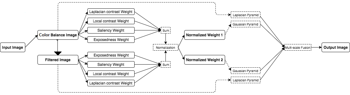 Built on the fusion principles, the strategy derives the inputs and the weight measures only from the degraded version of the image. In order to overcome the limitations of the underwater medium two inputs were defined that represent color corrected and contrast enhanced versions of the original underwater image, and also four weight maps that aim to increase the visibility of the distant objects degraded due to the medium scattering and absorption. The strategy is a single image approach that does not require specialized hardware or knowledge about the underwater conditions or scene structure. The fusion framework also supports temporal coherence between adjacent frames by performing an effective edge preserving noise reduction strategy. The enhanced images are characterized by reduced noise level, better exposedness of the dark regions, improved global contrast while the finest details and edges are enhanced significantly. Experimental validity of the method is done by qualitative and quantitative analysis on several images using image quality index -- Entropy and Contrast Improvement Index (CII).