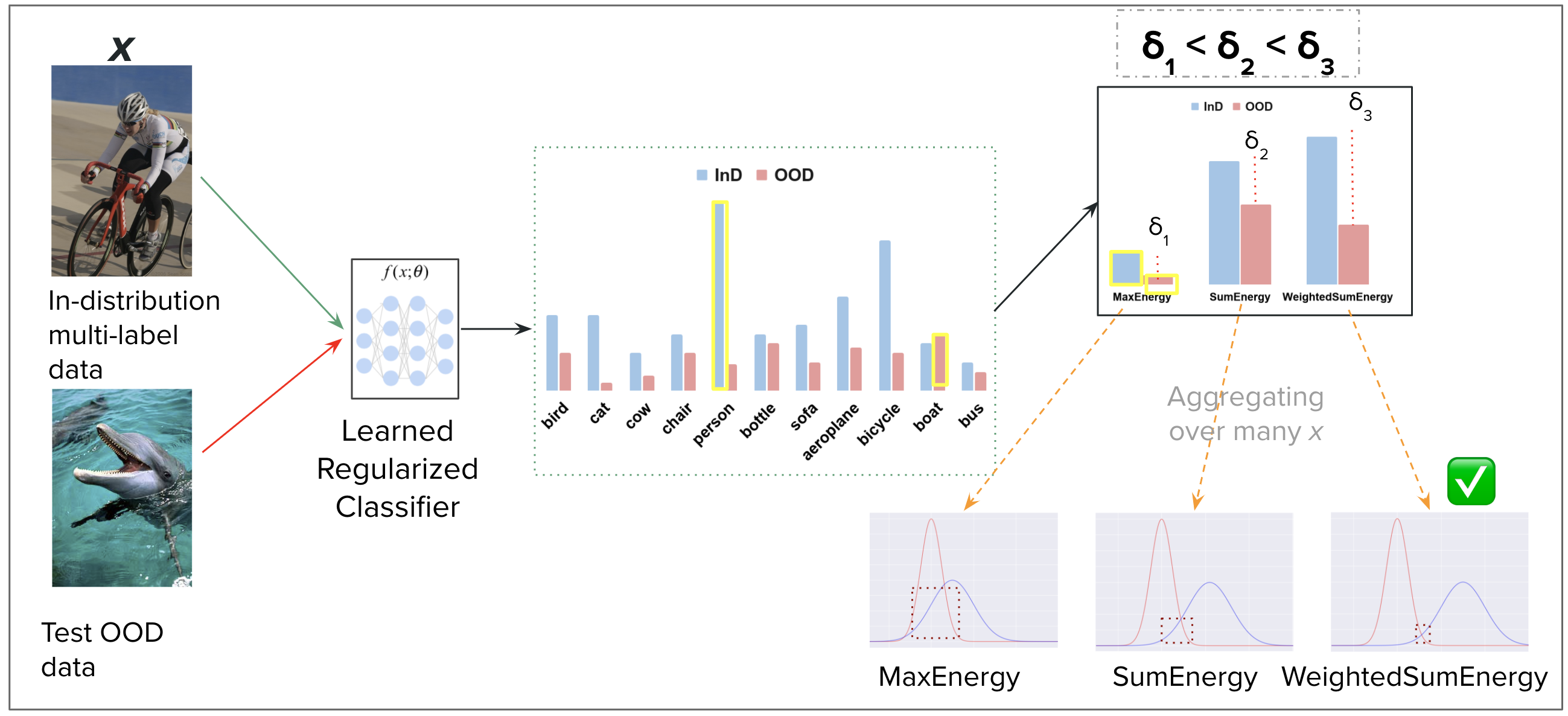 Robustness to out-of-distribution (OOD) samples during inference is an important goal in building reliable machine learning systems. OOD detection in multi-class classification have been explored significantly. On the other hand, it still remains an unexplored area in the case of multi- label classification. A recent development has shown that using SumEnergy, a method which aggregates energy scores from all the labels to obtain OOD indicator score, pro- vides significant improvement in the performance as compared to other baselines. But SumEnergy has only been applied on pre-trained networks and it naively sums energies of all the labels. We propose a new scoring function - WeightedSumEnergy (WSE), which appropriately weights the energies before summing them up. We also show theoretically that WSE is superior to SumEnergy. We propose a method (REO) for explicit regularization of energy scores on auxiliary OOD data during training time. We demonstrate the effectiveness of our methods on common multi-label classification benchmarks, PASCAL-VOC, COCO and NUS-WIDE with different auxiliary and test OOD datasets such as ImageNet and Texture. We show that WeightedSumEnergy reduces the FPR95 on pretrained models by 93% on an average when compared to SumEnergy, establish- ing state-of-the-art performance. We show that REO can reduce the FPR95 by up to 32.27% compared to the previous best baseline if SumEnergy is used. Moreover we get almost 0 FPR95 when WSE is used on models trained with REO, which shows the benefit of regularization.